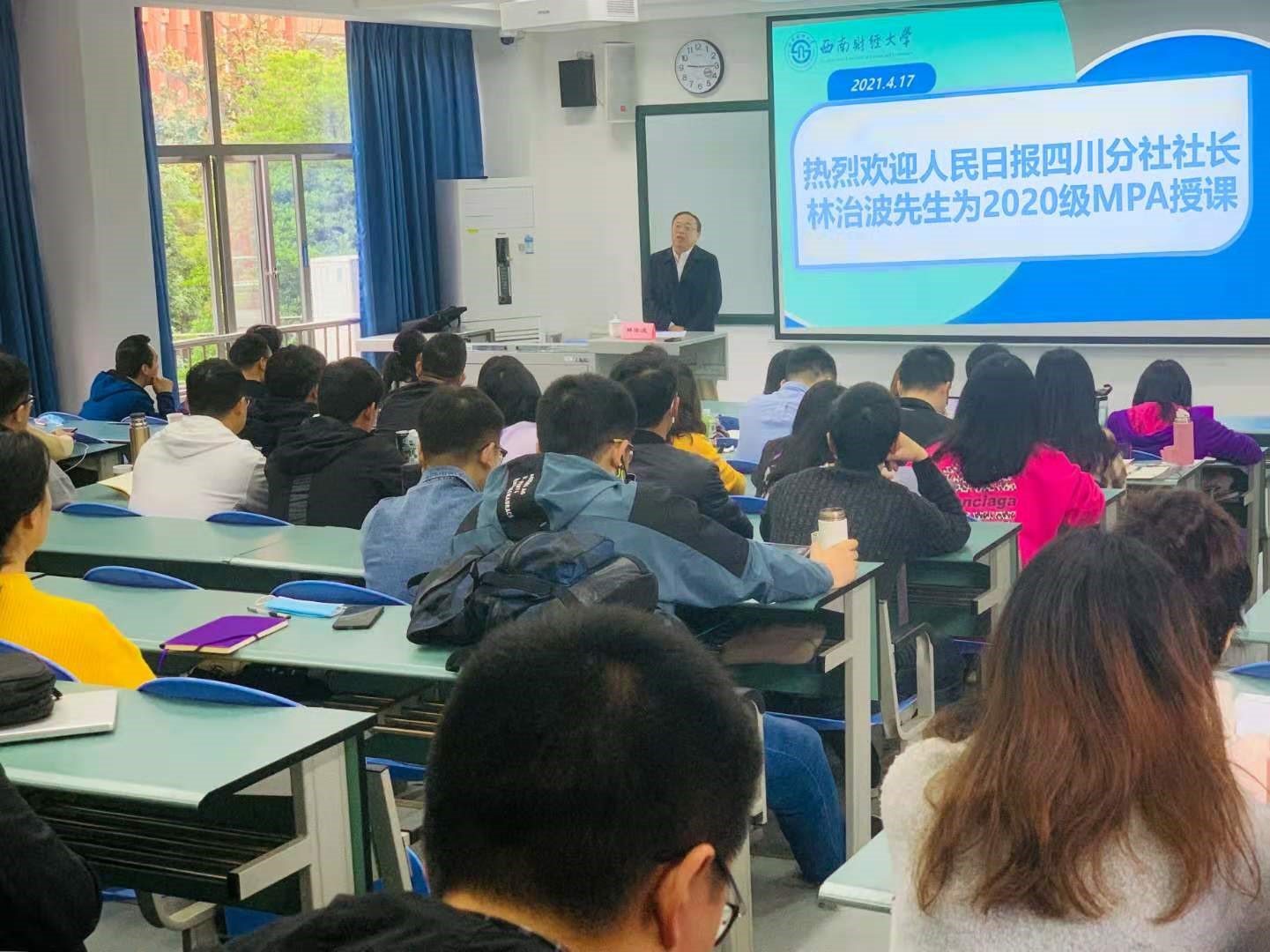 2021年4月17日上午,人民日報社四川分社社長林治波教授應邀為我校2020級MPA學生作“從黨史的學習中確立精神信仰,汲取前進力量”專題講座。西南財經(jīng)大學公共管理學院副院長、MPA教育中心副主任顧絢主持講座。